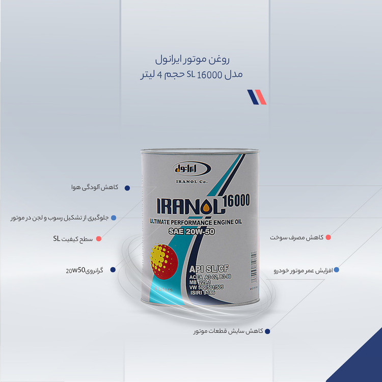 ایرانول 16000 با استفــاده از روغن پایه پارافینیک حاصل از پالایش برشی از نفت خام و انجــام فــرآیند پالایش با هیـدروژن (Hydro finishing) و مواد افزودنی مرغوب ، جهت استفاده در تمامی فصول و شرایط آب و هوایی تولید گردیده است.